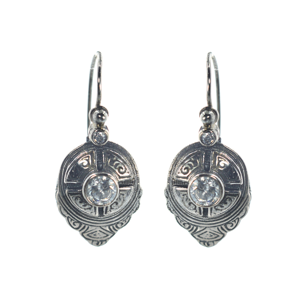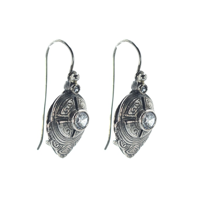 Ασημένια 925 κρεμαστά σκουλαρίκια με ζιργκόν. Παραδοσιακά γιαννιώτικα σκουλαρίκια με διακριτικό σκάλισμα και λευκό ζιργκόν.