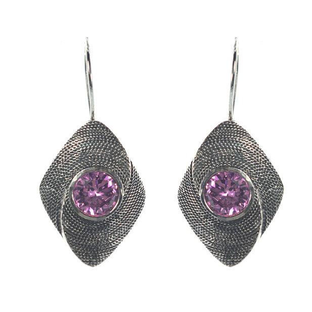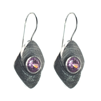 Ασημένια 925 κρεμαστά σκουλαρίκια με ζιργκόν. Παραδοσιακά γιαννιώτικα σκουλαρίκια με διακριτικό σκάλισμα και ροζ ζιργκόν.