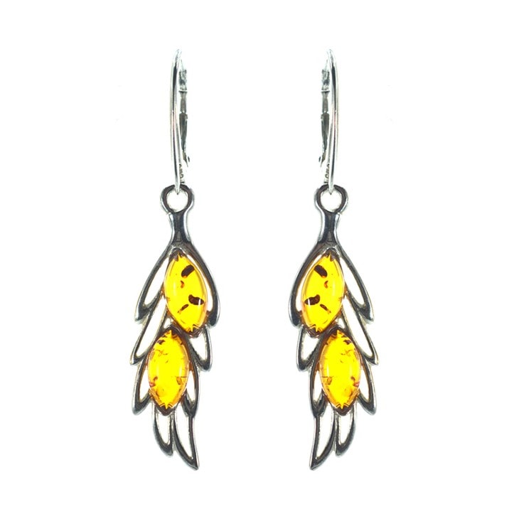 Ασημένια 925 σκουλαρίκια φτερά με κεχριμπάρι. Μοντέρνα κρεμαστά σκουλαρίκια φτερά με κεχριμπάρι Βαλτικής, κατάλληλα για πρωί ή βράδυ. Τα κεχριμπάρια συνοδεύει πιστοποίηση αυθεντικότητας.