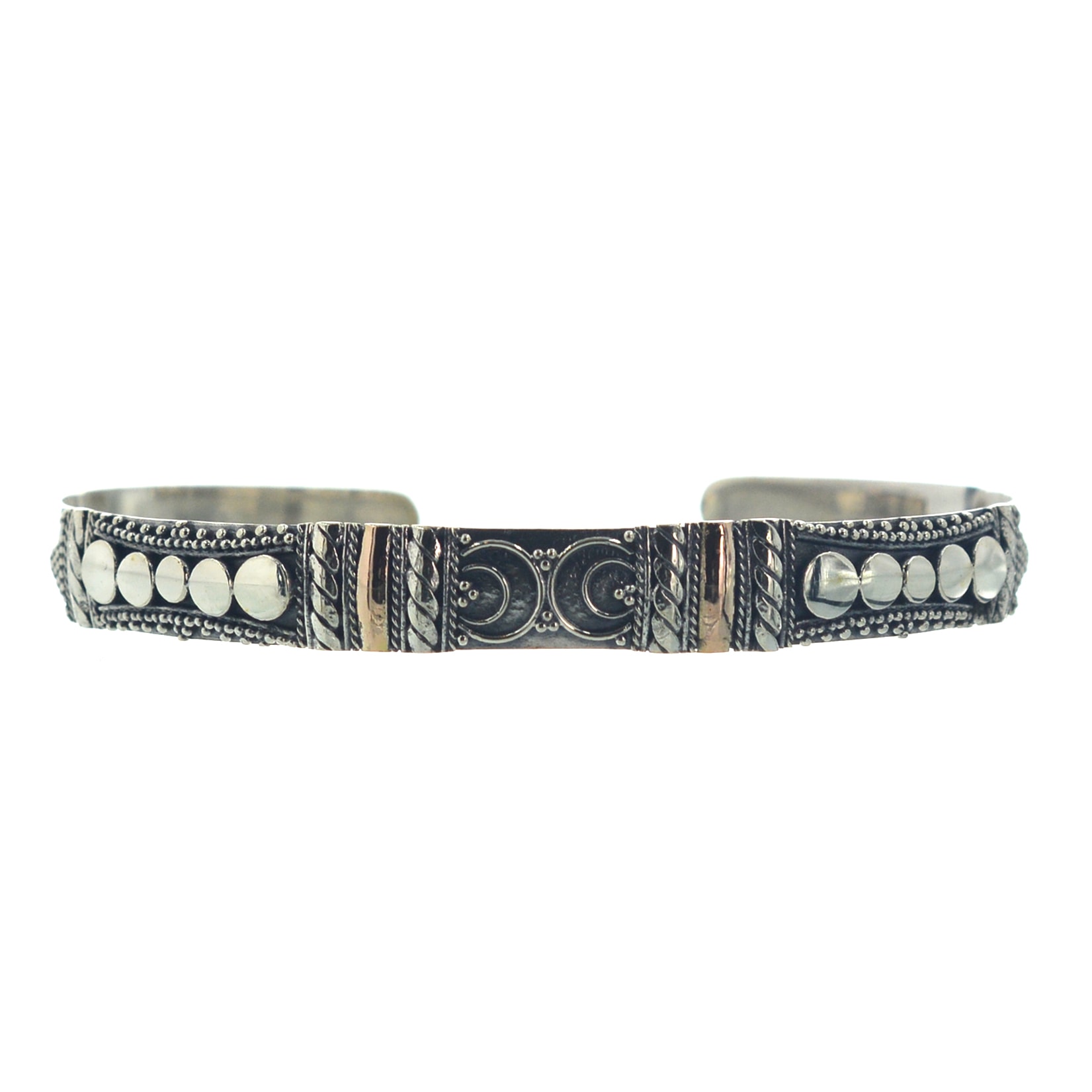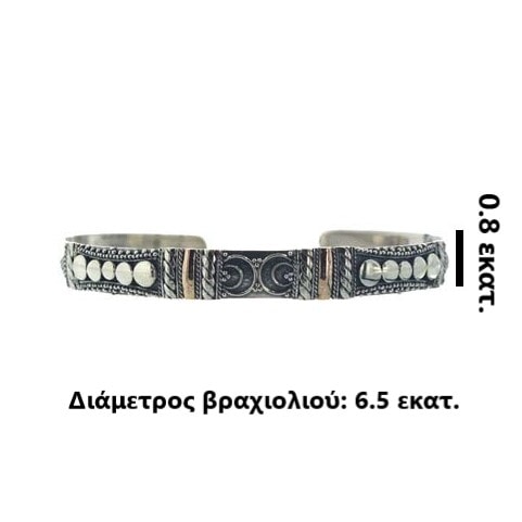 Ασημένιο 925 βραχιόλι με χρυσό 18Κ και υψηλή τεχνική φιλιγκράν. Χειροποίητο βραχιόλι με σκαλιστά μισοφέγγαρα και επίχρυσες λεπτομέρειες σε κλασική γραμμή. Ασκώντας μικρή πίεση με το χέρι σας στο συγκεκριμένο βραχιόλι μπορείτε να το προσαρμόσετε στο χέρι σας (μικραίνοντας ή μεγαλώνοντας τη διάμετρό του). Αυτό μπορεί να επιτευχθεί, καθώς μία από τις ιδιότητες του ασημιού είναι η ευκαμψία του.