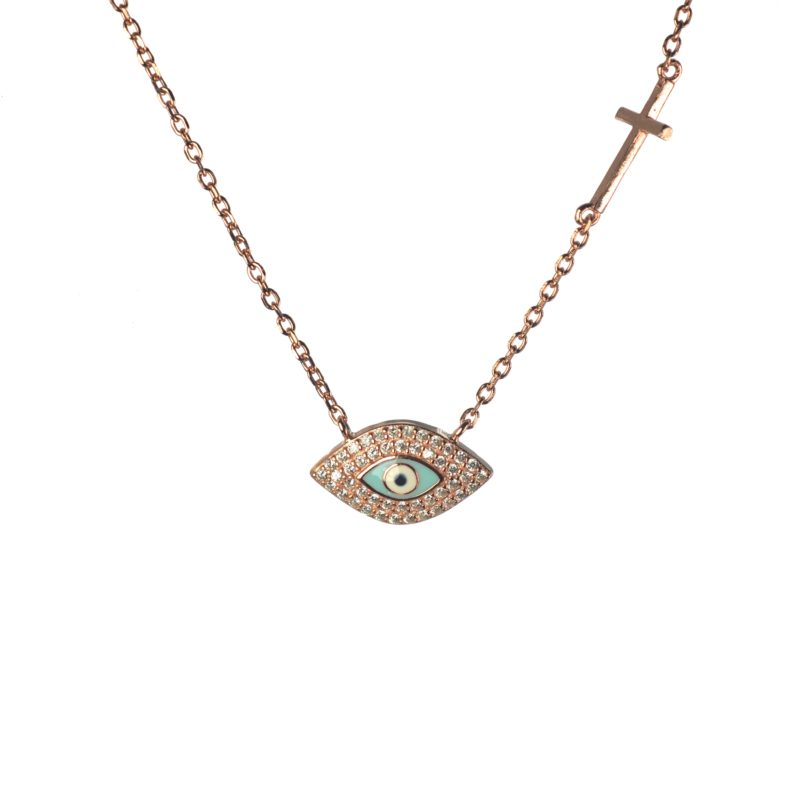 Ασημένιο 925 κολιέ με ματάκι και σταυρό σε ροζ χρυσό. Λιτό και διακριτικό, αυτό το κολιέ είναι κατάλληλο για κάθε μέρα. Μήκος: 45 εκατ. (40 + 5 εκατ. επέκταση).