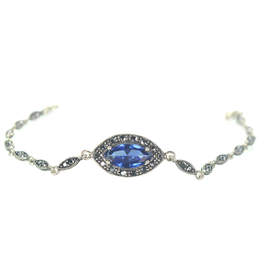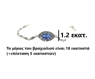 Ασημένιο 925 μαρκασίτη βραχιόλι με μπλε ζιργκόν πέτρα. Εντυπωσιακό βραχιόλι με καρφωμένους μαρκασίτες στο σχέδιο του. Μήκος βραχιολιού 18 εκατοστών με επέκταση 5 εκατοστών.