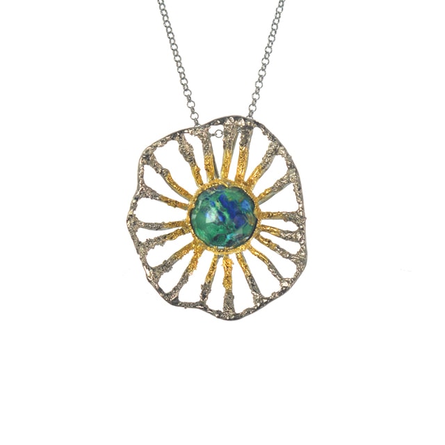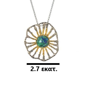 Ασημένιο 925 μενταγιόν ήλιος με αζουρίτη και επίχρυσες λεπτομέρειες στο κέντρο από τη συλλογή ΑΝΟΙΞΗ σε σχεδιασμό και παραγωγή της Cyttaro Alternative Jewellery. Η συλλογή περιλαμβάνει χειροποίητα κοσμήματα από ασήμι 925, φιλοτεχνημένα με ιδιαίτερες τεχνικές, σε μοναδικά σχέδια και χρώματα. Ανακαλύψτε όλη τη συλλογή στην ιστοσελίδα μας και κάντε το ομορφότερο δώρο στον εαυτό σας ή σε κάποιο αγαπημένο σας πρόσωπο.