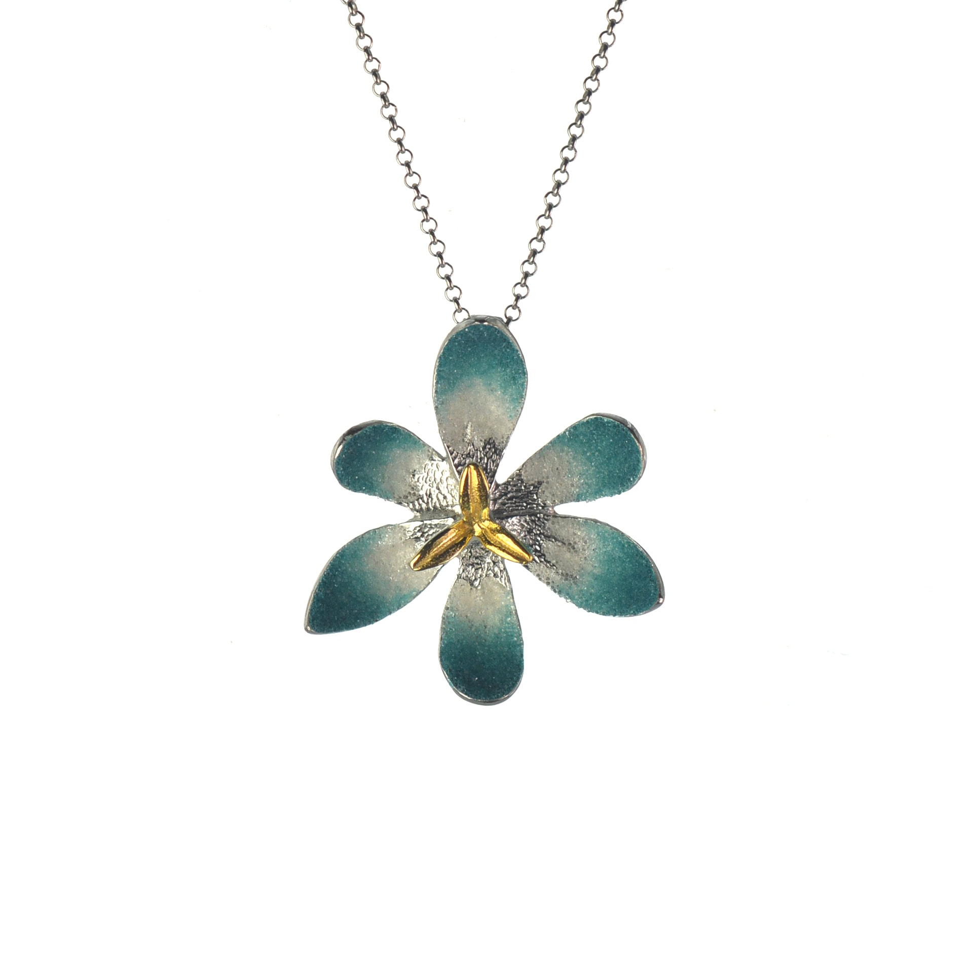 Ασημένιο 925 μενταγιόν λουλούδι με πετρόλ νανοκρύσταλλα και επίχρυση λεπτομέρεια στο κέντρο, από τη συλλογή ΑΝΟΙΞΗ. Σε σχεδιασμό και παραγωγή της Cyttaro Alternative Jewellery, η συλλογή περιλαμβάνει μοντέρνα χειροποίητα κοσμήματα από ασήμι 925. Ανακαλύψτε όλη τη συλλογή στην ιστοσελίδα μας και κάντε το ομορφότερο δώρο στον εαυτό σας.