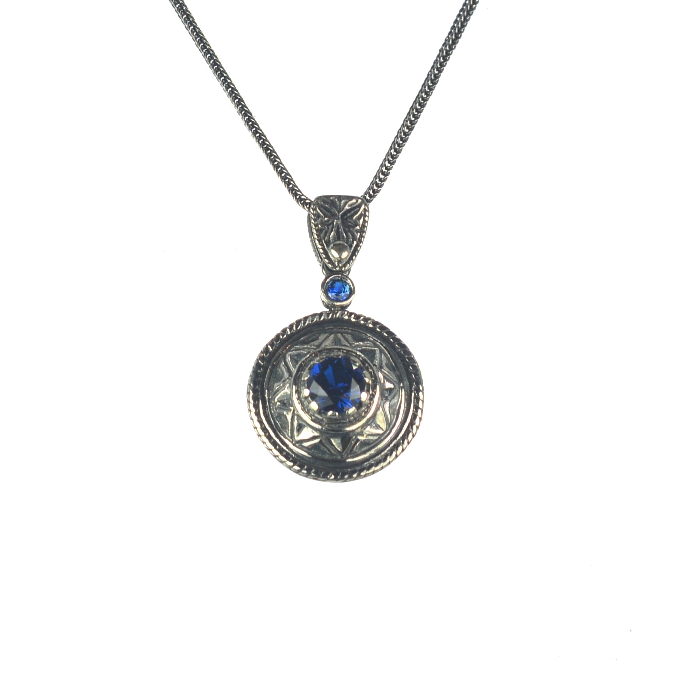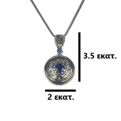 Ασημένιο 925 μενταγιόν με ζιργκόν. Χειροποίητο σκαλιστό μενταγιόν με μπλε πέτρες ζιργκόν και παραδοσιακό σχεδιασμό. Ανακαλύψτε όλη τη συλλογή με παραδοσιακά γιαννιώτικα κοσμήματα στην ιστοσελίδα μας και επιλέξτε το αγαπημένο σας! Κάντε κλικ στην επιλογή “Με αλυσίδα” για να πάρετε μαζί και μία αλυσίδα 45 εκατοστών (+ επέκταση 5 εκατοστών).