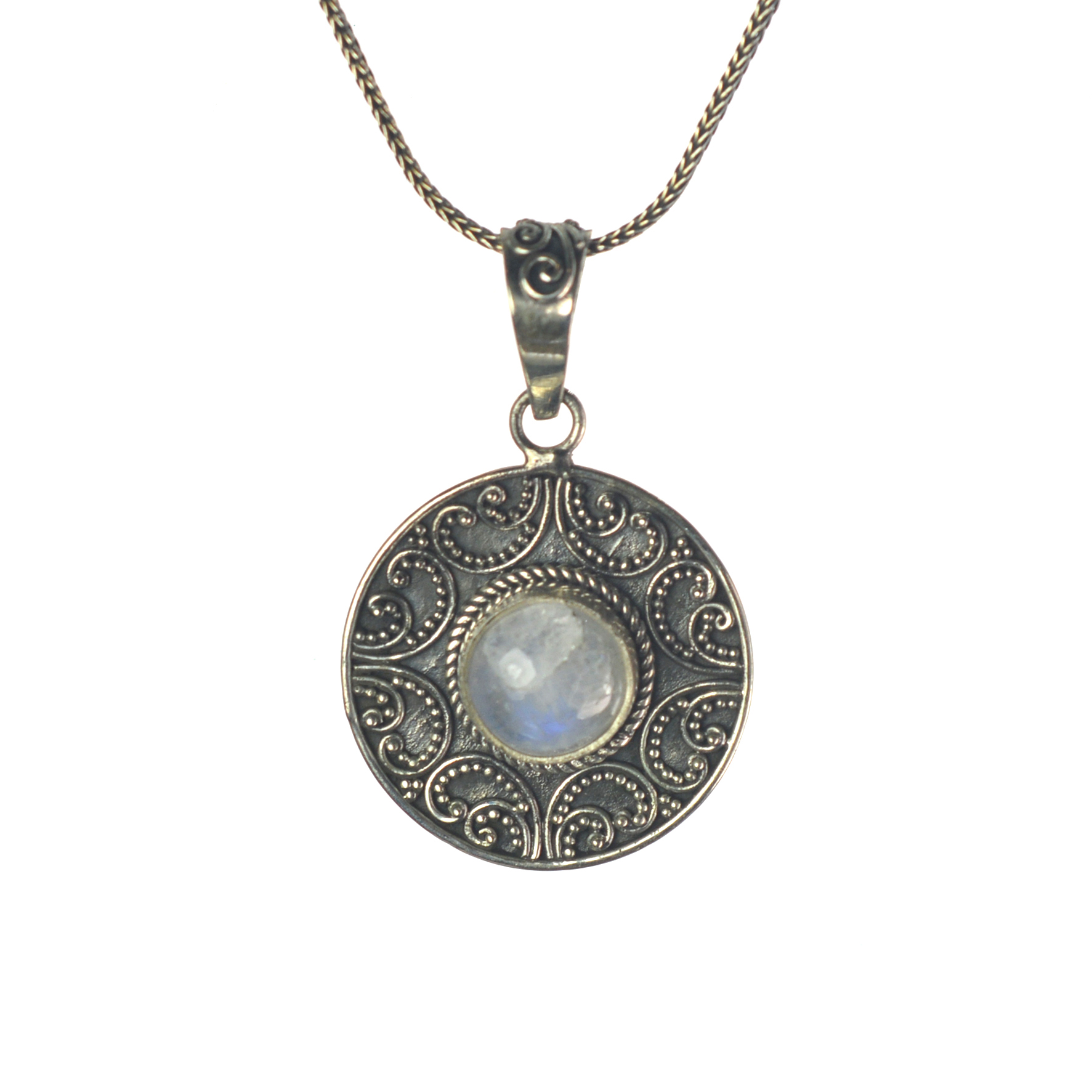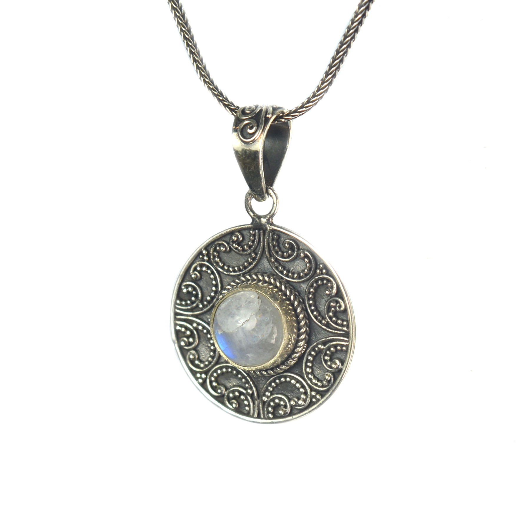 Ασημένιο 925 μενταγιόν με φεγγαρόπετρα, τεχνική φιλιγκράν και διακριτικό σκάλισμα, εμπνευσμένο από τη γιαννιώτικη παράδοση. Ανακαλύψτε όλη τη συλλογή στην ιστοσελίδα μας και κάντε το ομορφότερο δώρο στον εαυτό σας. Δώρο η ασημένια 925 αλυσίδα 45 εκατοστών.