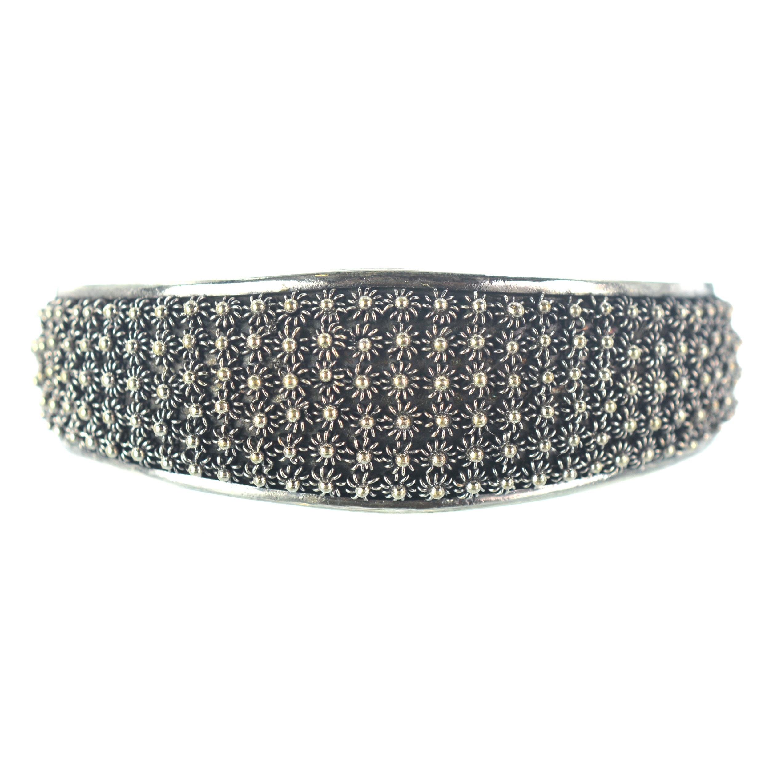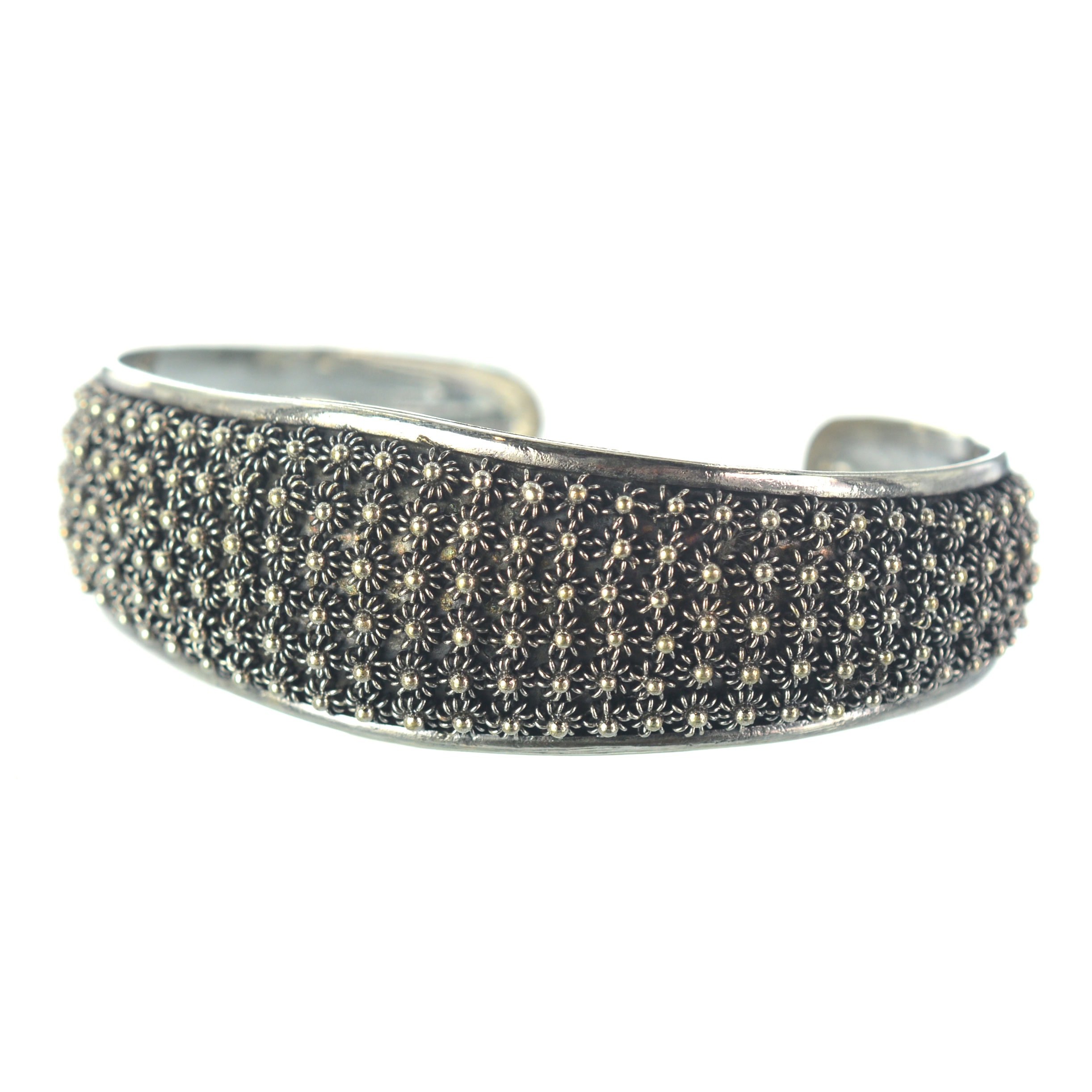 Ασημένιο 925 χειροποίητο βραχιόλι με υψηλή τεχνική φιλιγκράν. Χειροποίητο βραχιόλι με κλασικό, παραδοσιακό σχεδιασμό. Ασκώντας μικρή πίεση με το χέρι σας στο συγκεκριμένο βραχιόλι μπορείτε να το προσαρμόσετε στο χέρι σας (μικραίνοντας ή μεγαλώνοντας τη διάμετρό του). Αυτό μπορεί να επιτευχθεί καθώς μία από τις ιδιότητες του ασημιού είναι η ευκαμψία του.