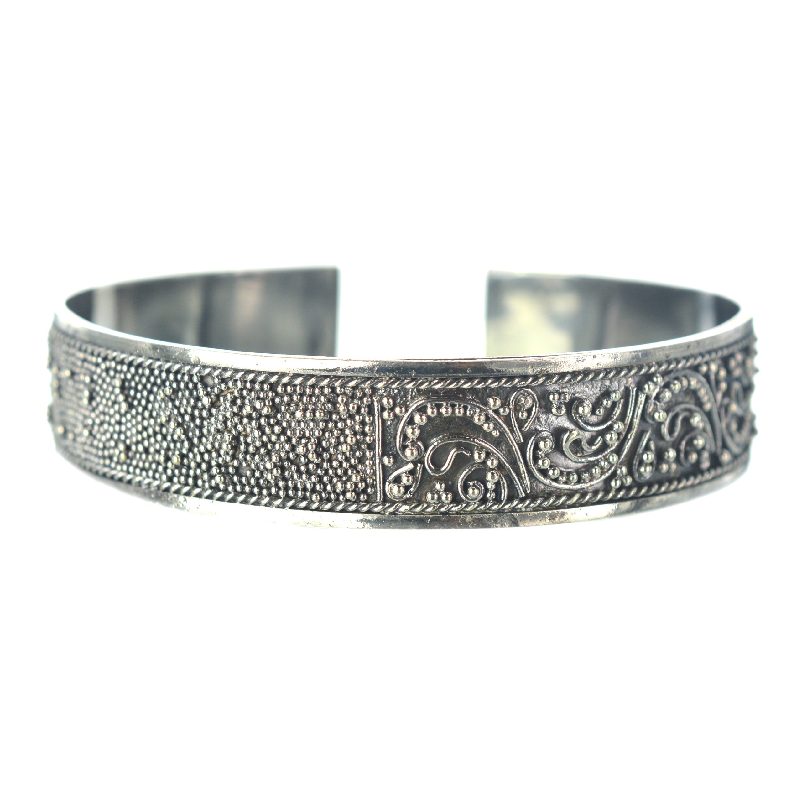 Ασημένιο 925 χειροποίητο βραχιόλι με υψηλή τεχνική φιλιγκράν. Χειροποίητο βραχιόλι με κλασικό, παραδοσιακό σχεδιασμό. Ασκώντας μικρή πίεση με το χέρι σας στο συγκεκριμένο βραχιόλι μπορείτε να το προσαρμόσετε στο χέρι σας (μικραίνοντας ή μεγαλώνοντας τη διάμετρό του). Αυτό μπορεί να επιτευχθεί καθώς μία από τις ιδιότητες του ασημιού είναι η ευκαμψία του.