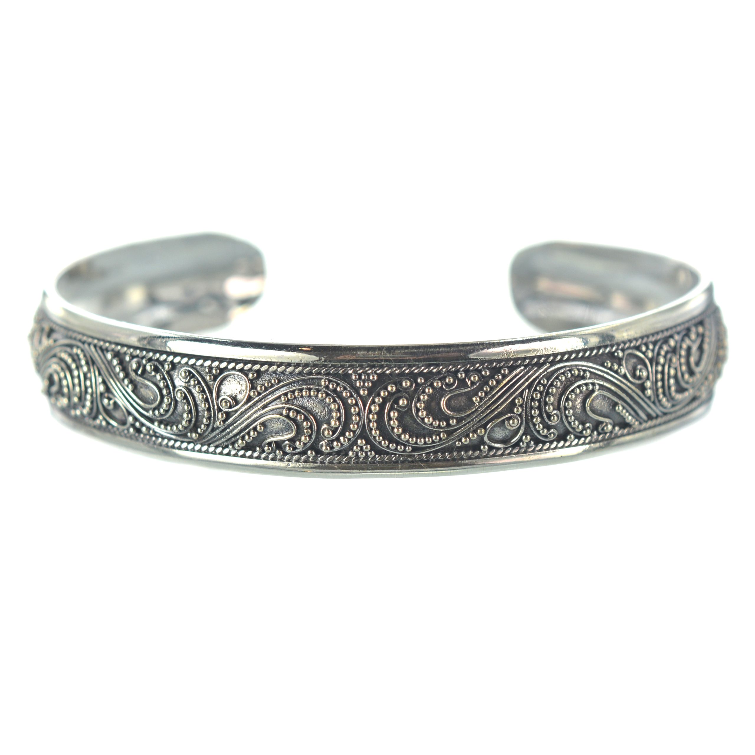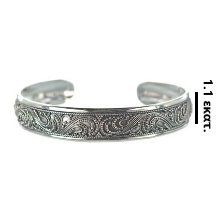 Ασημένιο 925 χειροποίητο βραχιόλι με υψηλή τεχνική φιλιγκράν. Χειροποίητο βραχιόλι με κλασικό, παραδοσιακό σχεδιασμό. Ασκώντας μικρή πίεση με το χέρι σας στο συγκεκριμένο βραχιόλι μπορείτε να το προσαρμόσετε στο χέρι σας (μικραίνοντας ή μεγαλώνοντας τη διάμετρό του). Αυτό μπορεί να επιτευχθεί καθώς μία από τις ιδιότητες του ασημιού είναι η ευκαμψία του.