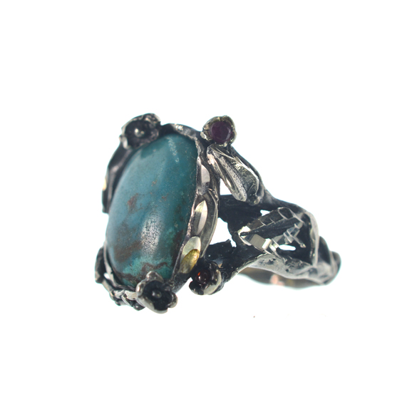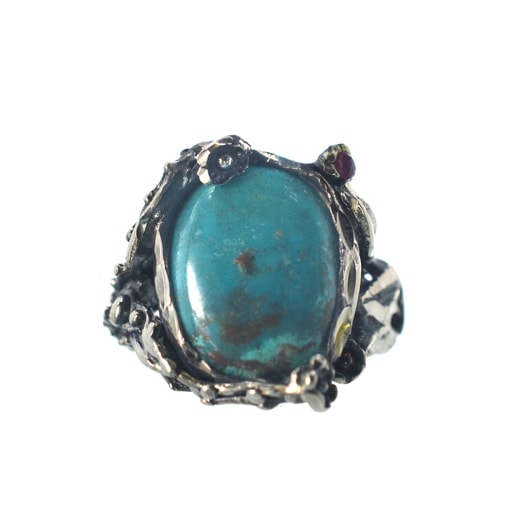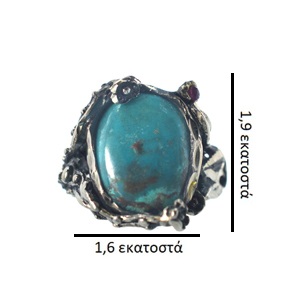 Ασημένιο 925 χειροποίητο δαχτυλίδι με τιρκουάζ και γρανάδα. Παραδοσιακό, χειροποίητο δαχτυλίδι με τιρκουάζ στο κέντρο. Την κεντρική πέτρα κοσμούν περιμετρικά κλαδιά, φύλλα και λουλούδια, δύο εκ των οποίων με γρανάδα. Μοναδικό δαχτυλίδι που χαρίζει ένα ιδιαίτερο στυλ. Ιδανικό δώρο για τον εαυτό σας ή κάποιο αγαπημένο σας πρόσωπο. Το συγκεκριμένο δαχτυλίδι διατίθεται σε οποιοδήποτε νούμερο.