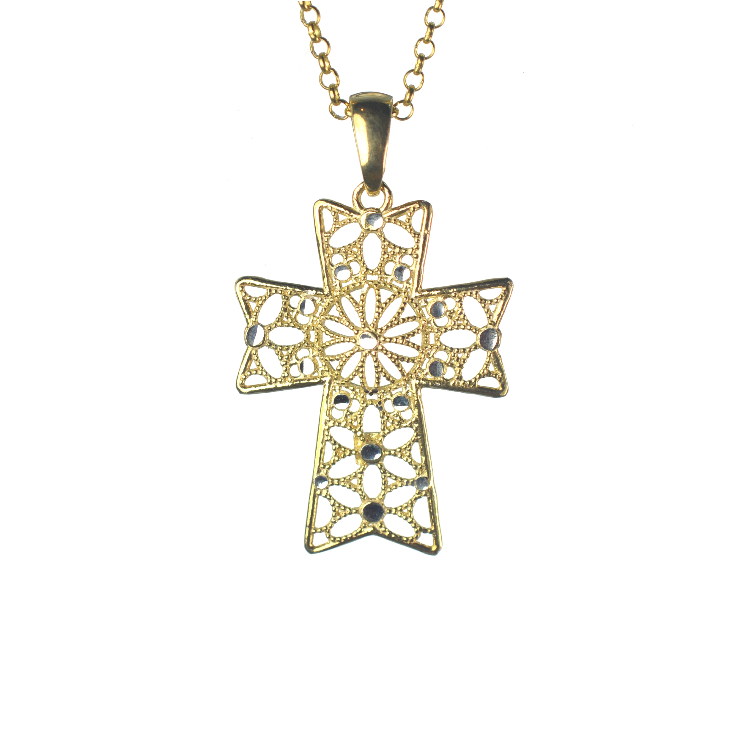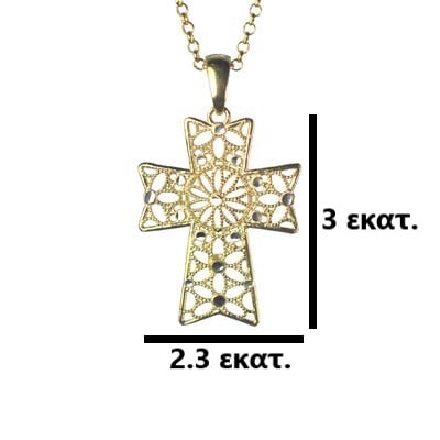 Ασημένιoς 925 σταυρός με τεχνική φιλιγκράν και επίστρωση χρυσού 14Κ. Κάντε κλικ στην επιλογή “με αλυσίδα” για να πάρετε μαζί και την αλυσίδα 40 εκατοστών (+5 εκατοστά επέκταση).