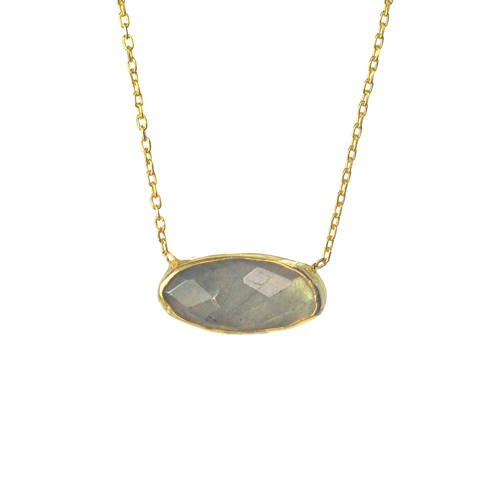 Επιχρυσωμένο κολιέ με λαμπραντορίτη από ασήμι 925. Μπορείτε να το φορέσετε μόνο του ή μαζί με άλλα για το απόλυτο layered look του καλοκαιριού. Ανακαλύψτε σήμερα όλη τη συλλογή στην ιστοσελίδα μας.